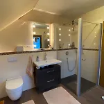 Im Apartment Paradies in der Vulkaneifel - Panoramablick und Wintergarten für jedes Wetter stehen Ihnen eine behindertengerechte Dusche und eine getrennte Toilette zur Verfügung, um Ihren Komfort zu verbessern. Zudem finden Sie im Badezimmer einen Haartrockner und Badelaken.